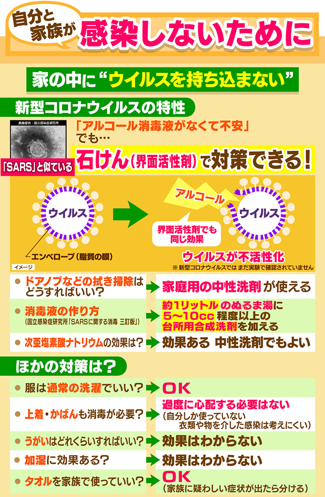 まとめておくと、界面活性剤は脂質でできたエンベロープに入り込んで膜を壊し、タンパク質を変性させる。油汚れを落とす原理と同じだから、日常の洗剤がウイルス対策にも使える。