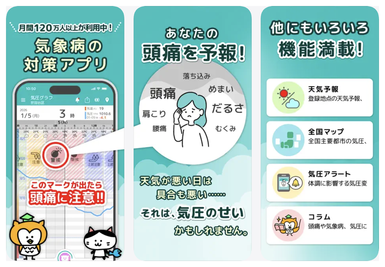 ダウンロード数の多い有名なアプリで、1時間ごとの気圧変化をグラフ表示し、不調リスクが高いタイミングをプッシュ通知で知らせてくれる。