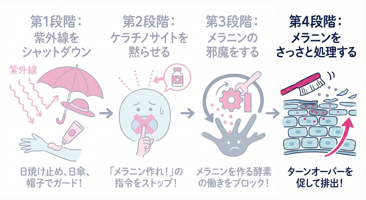ここからは、とにかくスピード勝負になる。メラニンが、肌に定着して「色素沈着」の状態になると、なかなか排除するのが難しくなるからだ。